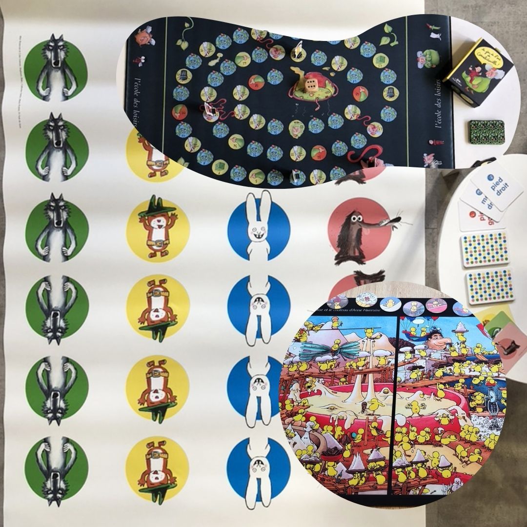 Le temps d'un après-midi, venez vous essayer aux jeux géants de l’Ecole des loisirs : Twister, Jeu de l’oie Cornebidouille et Cherche et trouve des poussins de Claude Ponti.