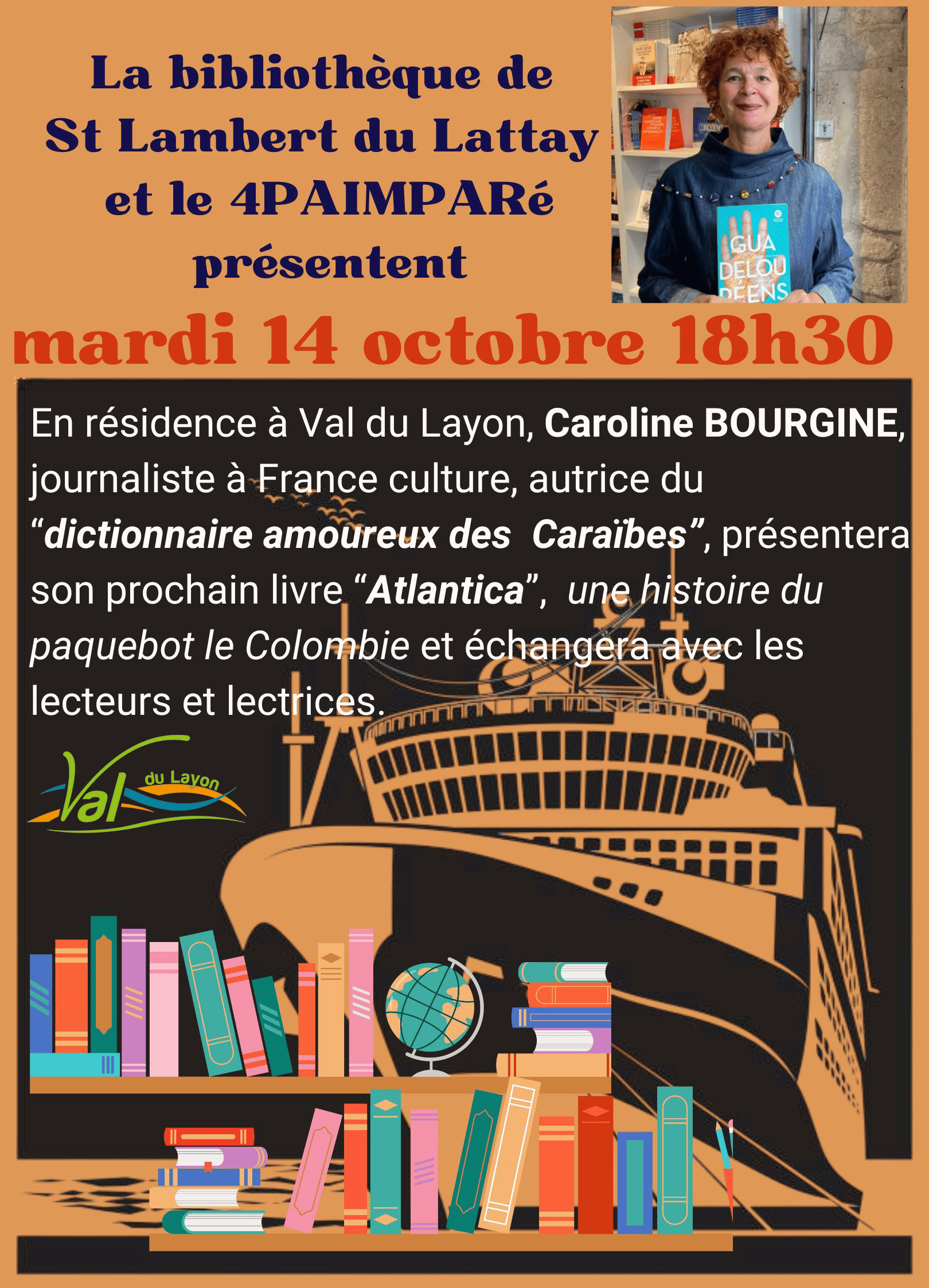 En résidence à Val-du-Layon au 4PAINPARRé, la journaliste de France culture Caroline Bourgine présentera son roman "Atlantica", une histoire sur le paquebot Le Colombie. Elle échangera avec les lecteurs sur son travail d'autrice ainsi que sur ses autres ouvrages Guadeloupéens et dictionnaire amoureux des Caraïbes.